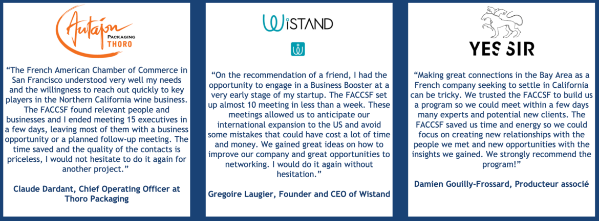 Support from the French American Chamber of Commerce California’s extensive network and expertise.