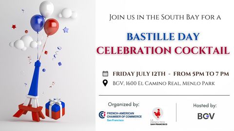 The 2024 Bastille Day Celebration Cocktail will be held on Friday, July 12th from 5 to 7 pm (PST) and hosted by our friends at BGV, 1600 El Camino Real Suite 280, Menlo Park, CA 94025.