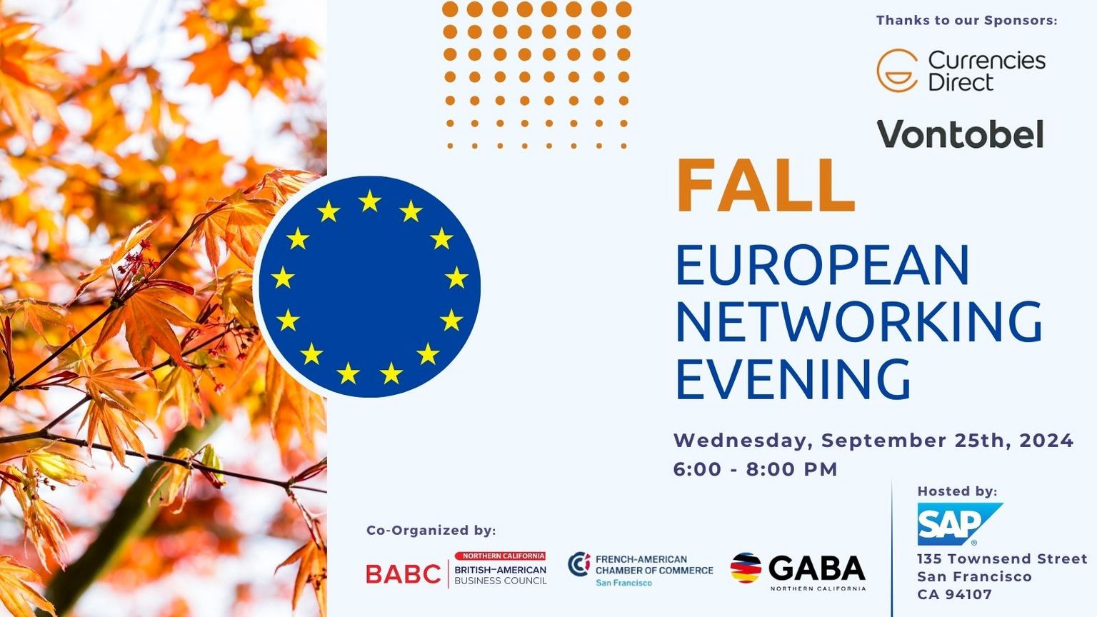 The British-American Business Council (BABC), German American Business Association (GABA), French American Chamber of Commerce (FACCSF) in cooperation with the American-European Chambers of Commerce and Business Associations, invite you to join us for another wonderful European Networking Event.