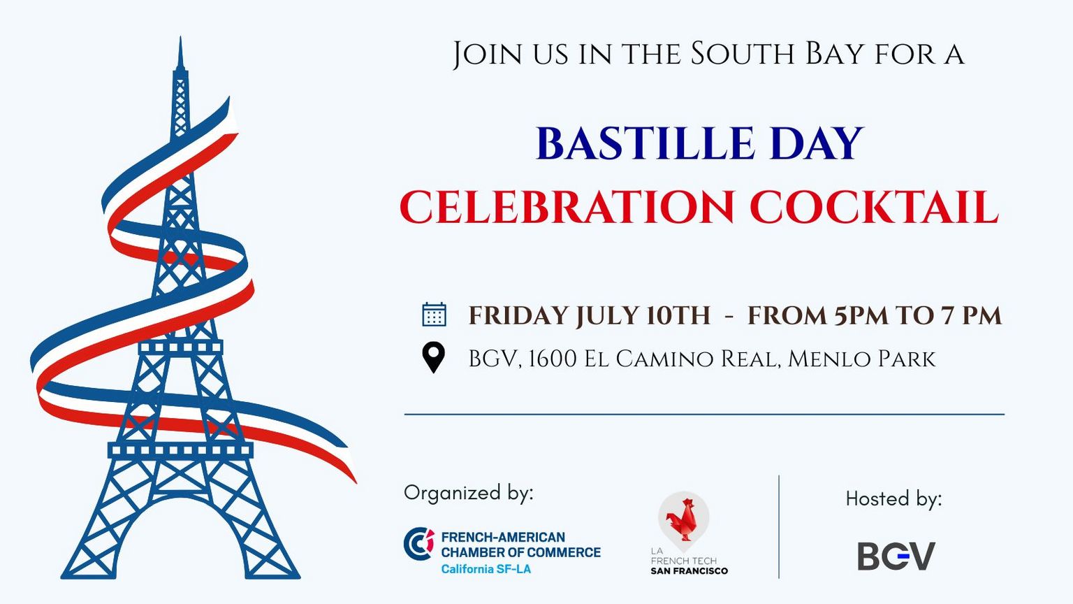 The 2026 Bastille Day Celebration Cocktail will be held on Friday, July 10th from 5 to 7 pm (PST) and hosted by our friends at BGV in their beautiful courtyard in Menlo Park.