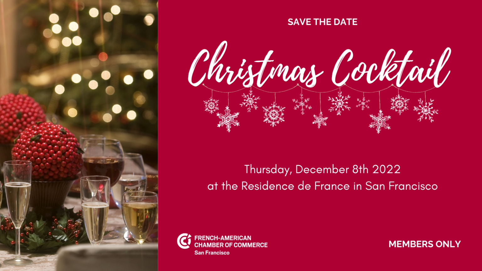 The Consul General of France, Frédéric Jung, and the co-Presidents of the FACCSF, Amy de rouvray and Ludovic Ulrich, are happy to welcome our members at the Residence de France for an exclusive Christmas Cocktail with the French-American Business community Thursday, December 8th 2022.