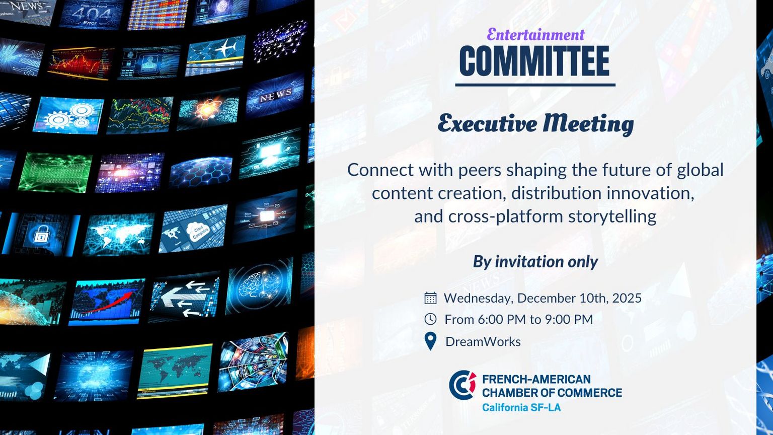 Join the French American Chamber of Commerce (FACC) Entertainment Committee for an invitation-only executive meeting, bringing together Los Angeles' most influential entertainment leaders from major studios, streaming platforms, production companies, and technology innovators.