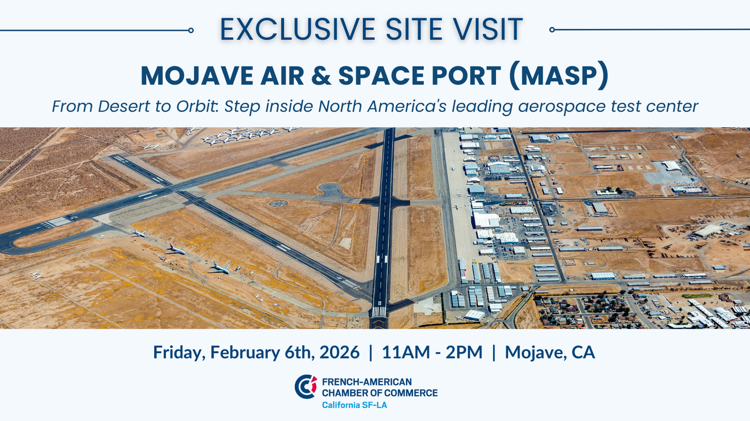 Our Mobility Committee invites you to discover one of the world’s most innovative aerospace hubs with an exclusive guided visit to Mojave Air and Space Port, home to cutting-edge flight‑test programs, space ventures, and iconic experimental aircraft.
