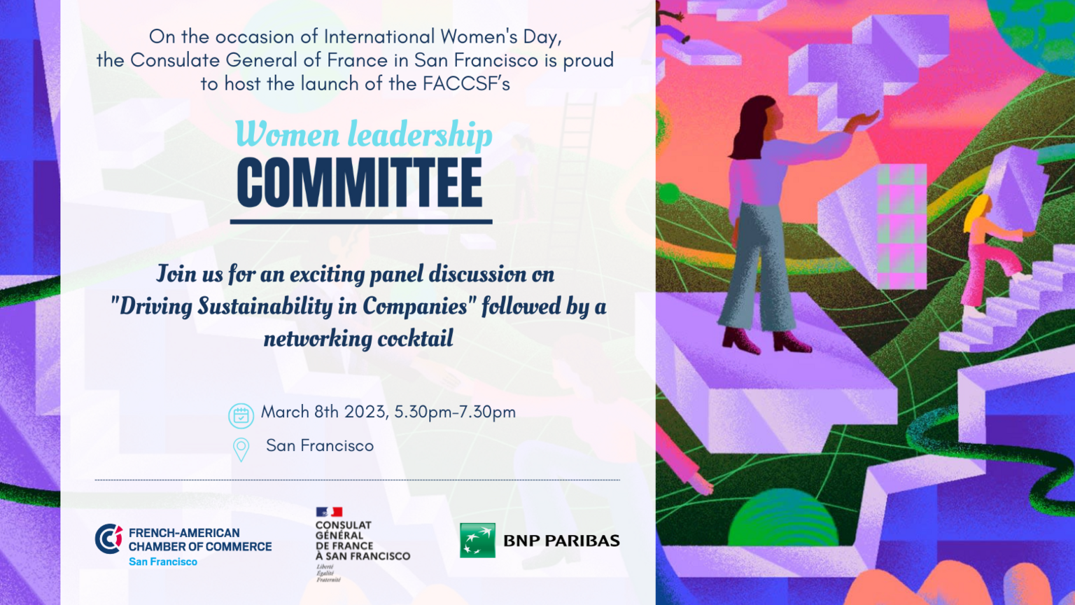 On the occasion of the International Women's Day, the Consul General of France in San Francisco, Frédéric Jung, will host the launch of our Women leadership Committee, co-chaired by Isabelle Marcus and Catherine Lewi, with a panel discussion on "Driving Sustainability in Companies", followed by a networking cocktail.