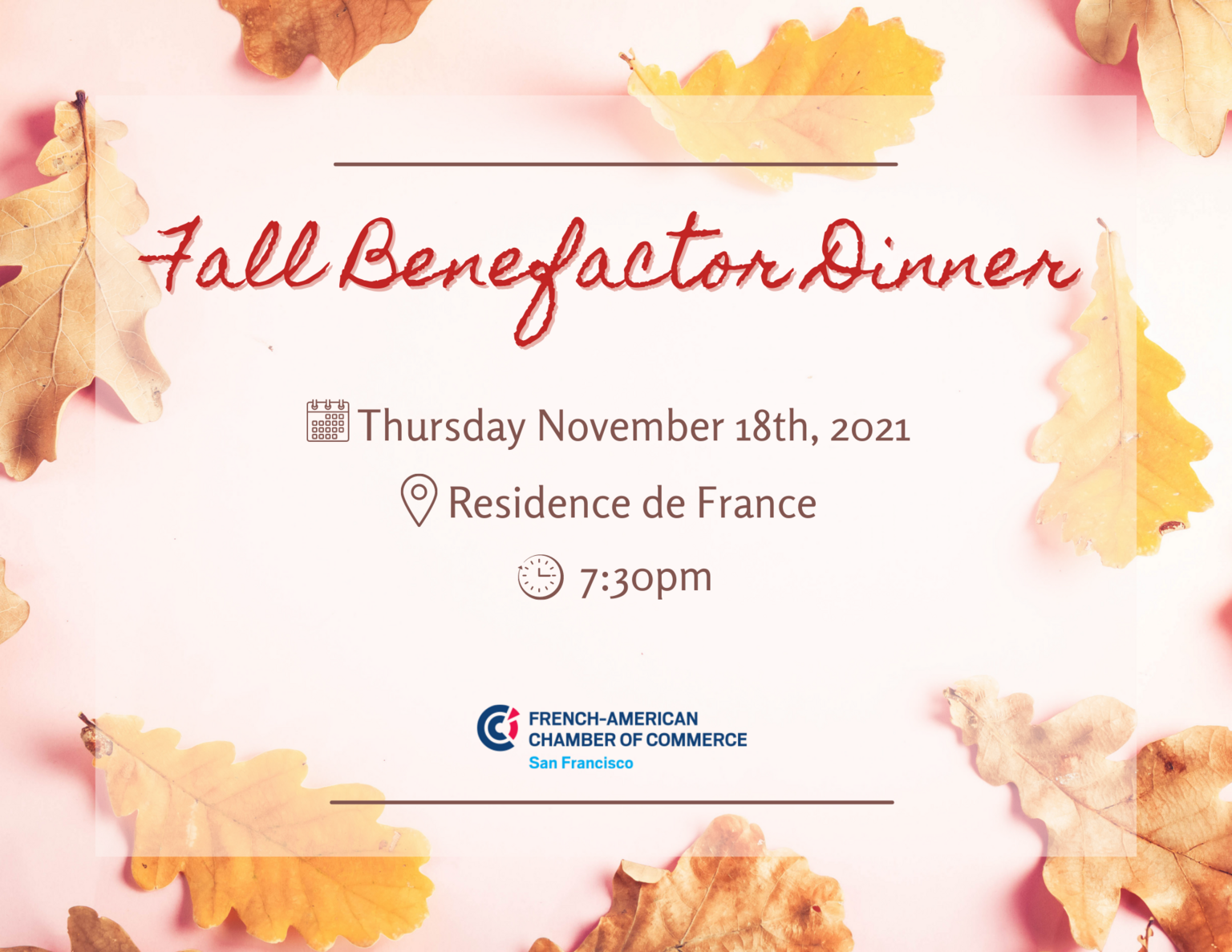 To thank them for their generous, continued support of the French-American Chamber of Commerce, our Benefactor members will have the opportunity to gather and exchange views on current affairs and the state of their business, around the Consul General of France, Frédéric Jung, and our 2 co-Presidents François Gros and Ludovic Ulrich.