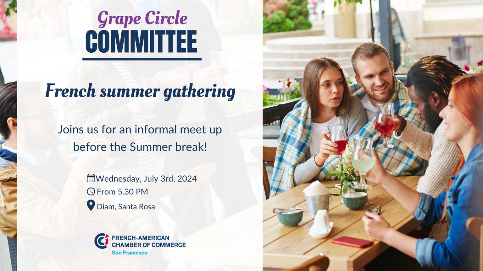 Before the Summer break, the FACCSF GrapeCircle Committee will be happy to welcome you for an informal gathering on July 3rd in Santa Rosa, around drinks and bites.