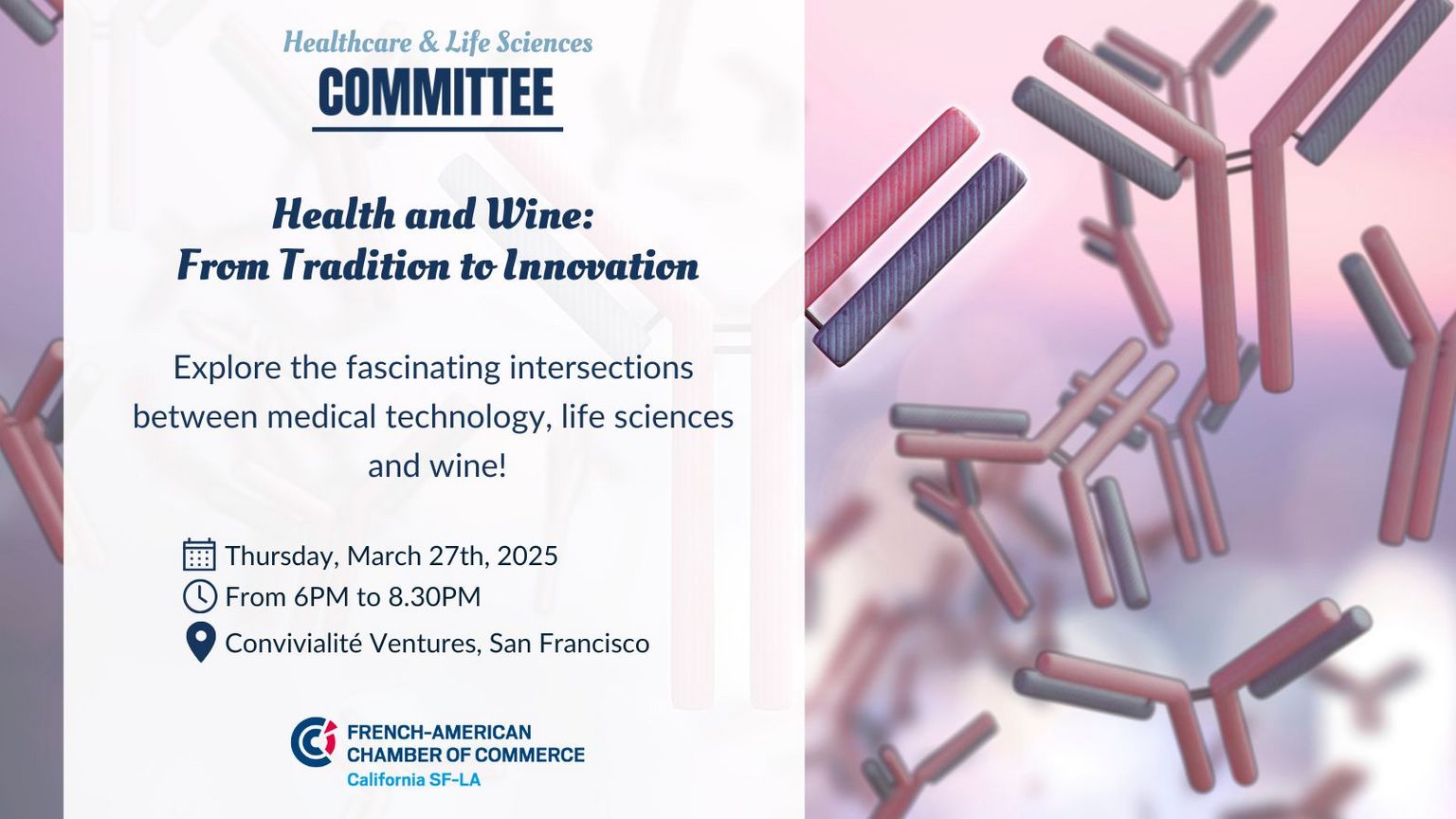 This event is perfect for healthcare professionals, innovators, and wine enthusiasts. Enjoy an evening of stimulating discussion, networking, and, of course, a taste of French wine.