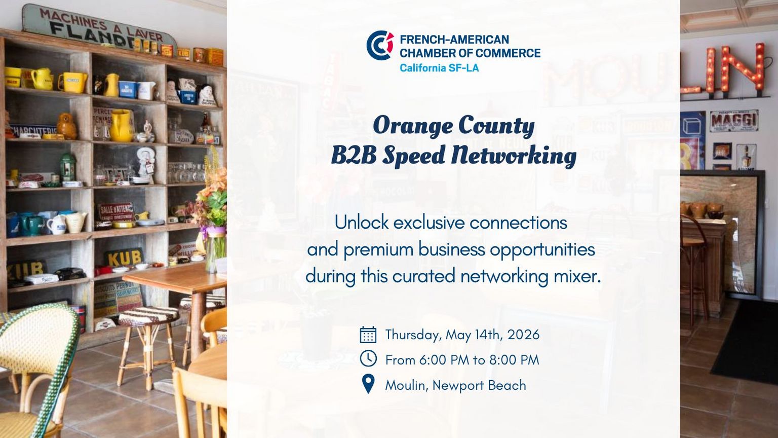 The French American Chamber of Commerce California invites you to a B2B Speed Networking event in Orange County. Unlock exclusive connections and premium business opportunities during this curated networking mixer. Event that bridges OC and LA business communities!