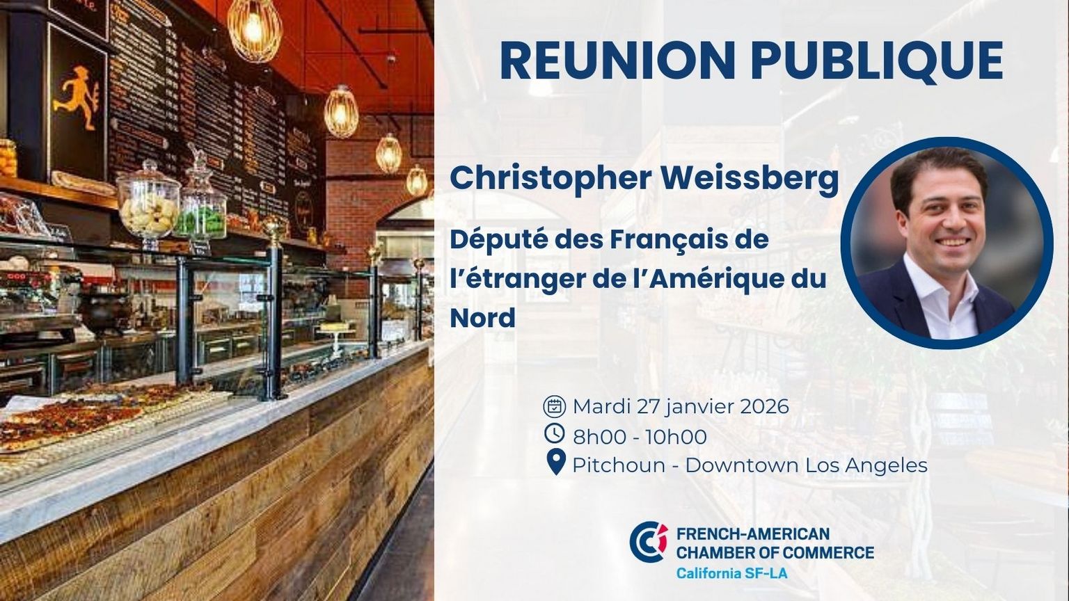 Rencontrez Christopher Weissberg, Député des Français de l’étranger de l’Amérique du Nord, lors d’une réunion publique à Los Angeles. Cette rencontre conviviale et privilégiée est une occasion unique d’échanger directement avec votre représentant et de poser vos questions.