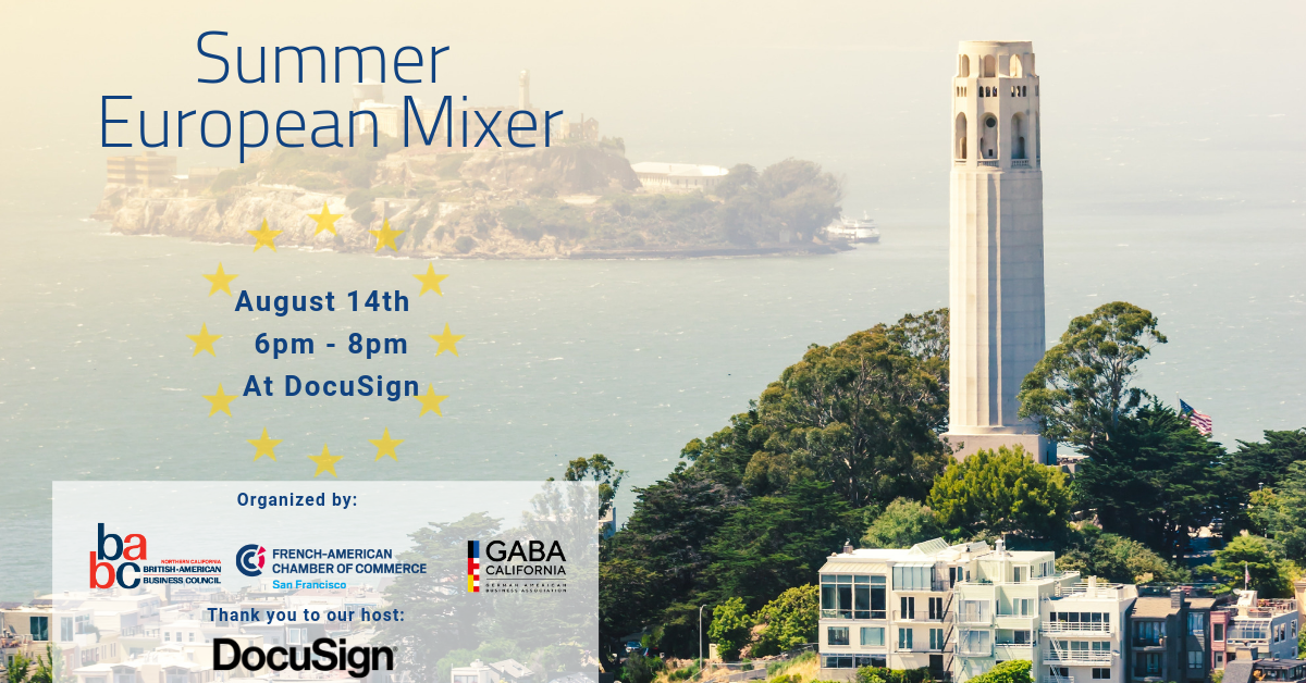 The German American Business Association (GABA), British-American Business Council (BABC) and French American Chamber of Commerce (FACC) in cooperation with the Swiss-American Chamber of Commerce, Danish-American Chamber of Commerce, the Business Association Italy America (BAIA), the California-Spain Chamber of Commerce, the German American Chamber of Commerce (GACC), the Irish Network Bay Area, the Swedish American Chamber of Commerce (SACC), the US-Polish Trade Council, the Hungarian American Chamber of Commerce and the American-European Chambers of Commerce and Business Associations, invite you to join us for another wonderful European Networking Event.