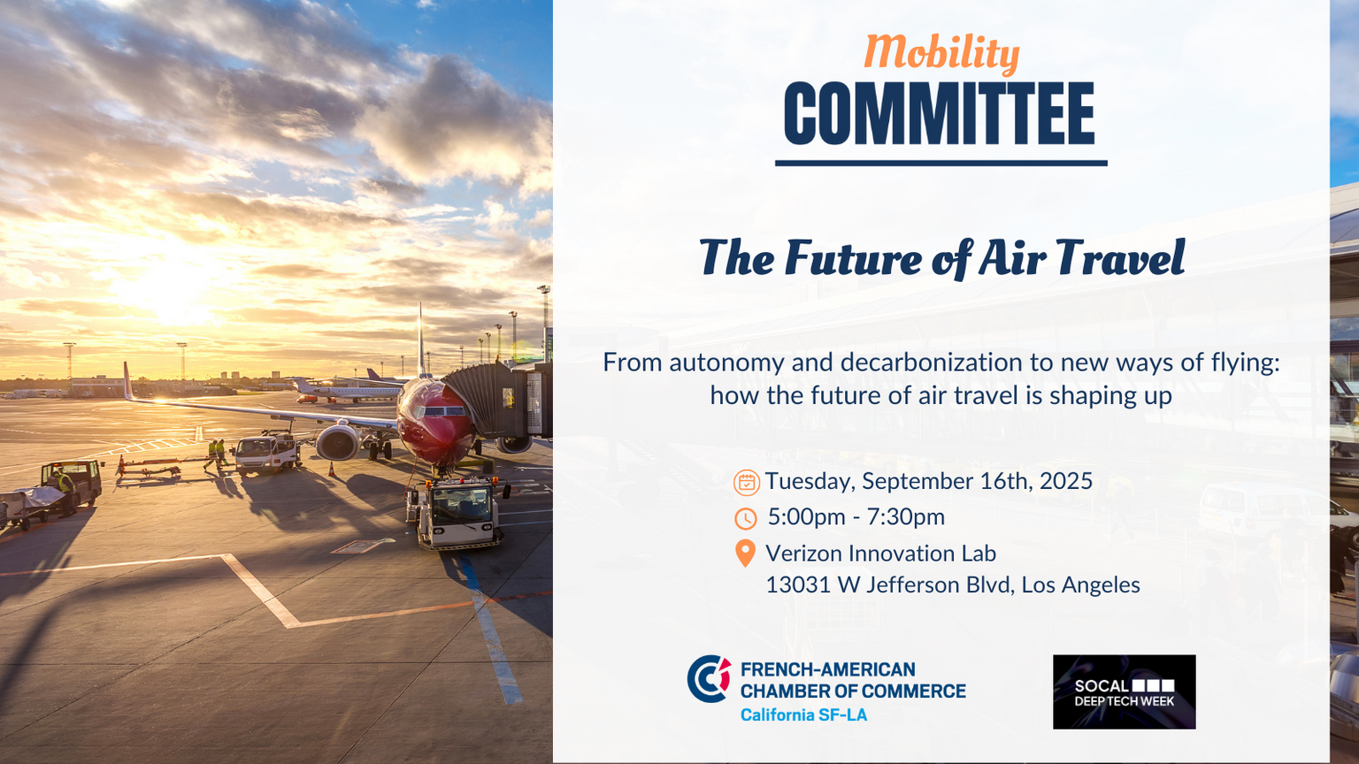 As part of SoCal Deep Tech Week, the flagship event gathering leaders in Aerospace & National Security, Nuclear & New Energy, and Advanced Manufacturing & Robotics, our Mobility Committeeis thrilled to invite you to an exclusive discussion on The Future of Air Travel from both US and European perspectives.