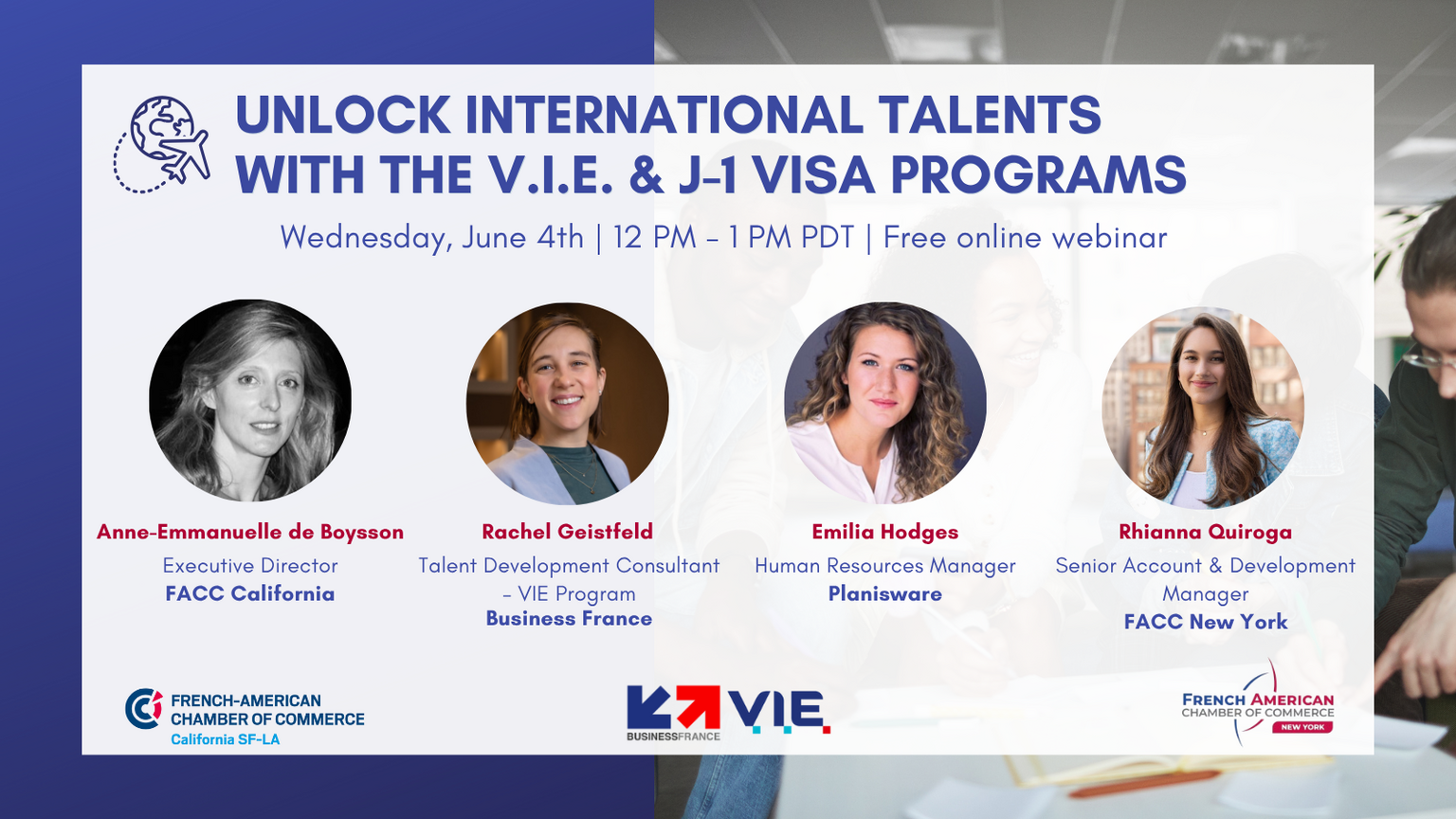 The FACC California SF-LA and Business France North America invite you to an engaging panel discussion, “Unlock International Talent with the V.I.E. & J-1 Visa Programs”, featuring special guests from Planisware and FACC New York.