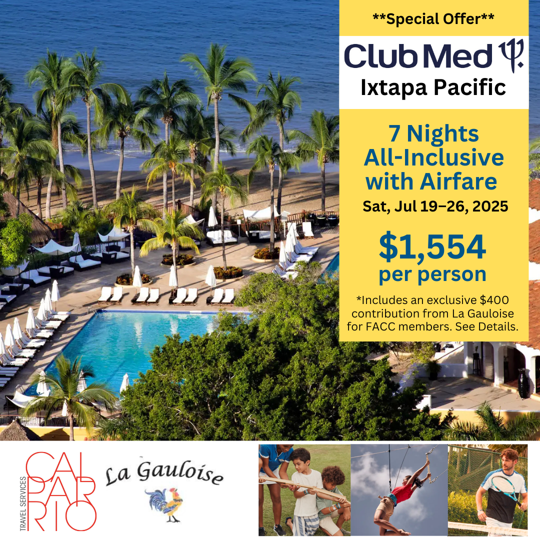 Escape to paradise with this unbeatable offer for FACC members, powered by La Gauloise and Calparrio Travel: 7 Days All-Inclusive at Club Med Ixtapa Pacific, including airfare, for just $1,554 per person!