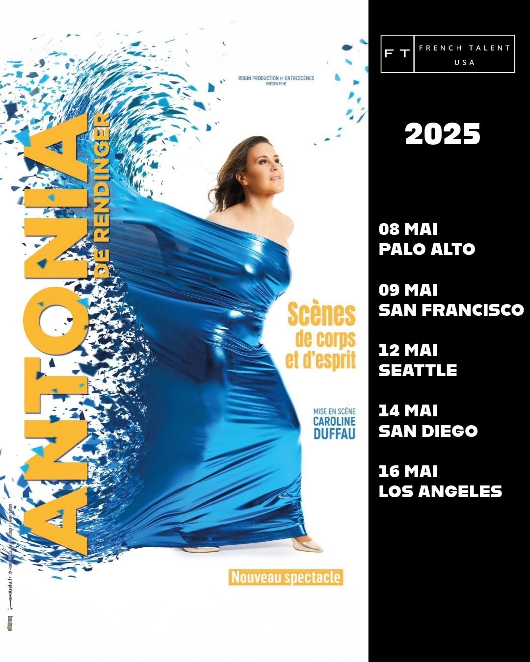 French Talent USA is proud to present the upcoming show in French Antonia de Rendinger: Scènes de Corps et d’Esprit, an even more vibrant and brilliant show than the previous one, driven by sharp writing and smart staging. With a gallery of new characters and carefully chosen topics, she promises an unforgettable theatrical experience!