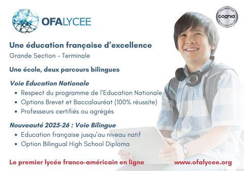 OFALYCÉE™, the First Online French-American School, is an online French school, accredited by Cognia, that blends the French and American educational systems from Kindergarten to 12th grade in a bilingual and bicultural program.
